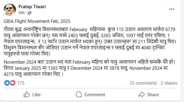 विमानस्थलका महाप्रबन्धक प्रतापबाबू तिवारीले आफ्नो फेसबुक पेजमार्फत सार्वजनिक गरेको विवरणअनुसार फेब्रुअरी २०२५ मा कुल ११५ उडान–अवतरणमार्फत ६,७७९ यात्रु ओहोर–दोहोर गरेका छन्। यो संख्यामा गौतम बुद्ध अन्तर्राष्ट्रिय विमानस्थलमा अन्तर्राष्ट्रिय उडान सुरु भएयताकै सबैभन्दा बढी हो।