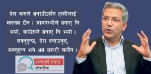 अनि के भयो त ? यो देश बन्यो भने कुनै एउटा पार्टी या संगठनको भविष्य धरापमा परेर देशलाई के हानि ? अस्तित्व धरापमा पर्ने भनेको त हामी प्रतिपक्षमा बस्ने न हो। यो देश विकास होस् न। मैले त बारम्बार भनेको छु, देश कसले बनाउँछसँग हामीलाई मतलब छैन। वामपन्थीले बनाए नि भयो, कांग्रेसले बनाए नि भयो। तर मेरा छोराछोरीका लागि र मेरो बुढेसकालको लागि यो देश बन्नुपर्छ। सक्नुहुन्छ, देश बनाउनुस्, सक्नुहुन्न भने अब यसरी चल्दैन। हामी तपाईंहरूलाई विस्थापित गर्छौं।