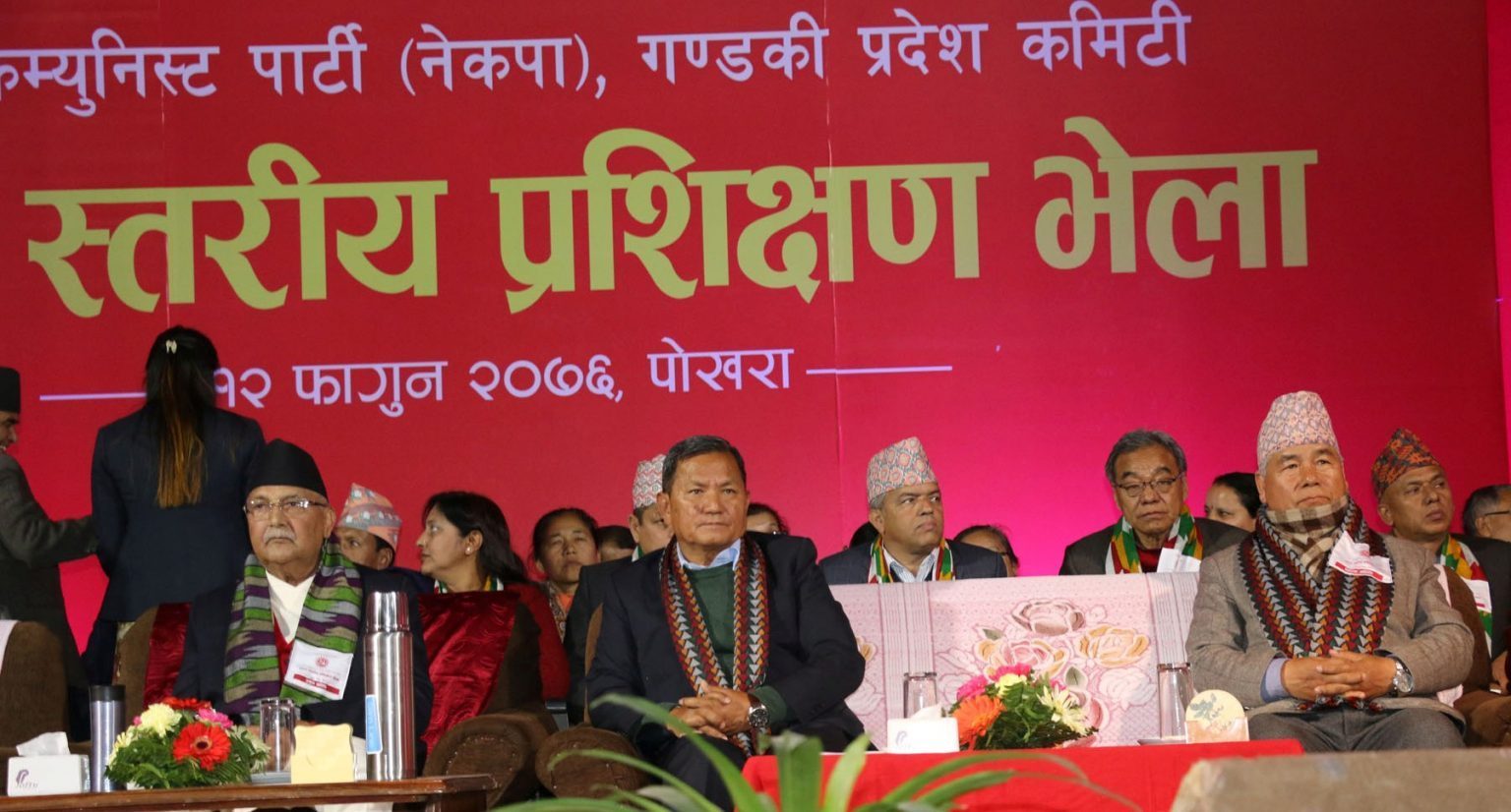 नेकपा गण्डकी प्रदेशद्वारा सोमवार आयोजित प्रदेशस्तरीय प्रशिक्षण भेलालाई सम्बोधन गर्दै उहाँले समृद्ध नेपालका लागि सुशासन र विकासलाई सरकारले प्राथमिकतामा राखेर अगाडि बढेको बताउनुभयो । राष्ट्रिय आकाङ्क्षालाई पूरा गर्न सरकारसँग सकारात्मक दृष्टिकोेण रहेको उल्लेख गर्दै प्रधानमन्त्री ओलीले त्यसलाई पूरा गर्ने उच्च सामथ्र्यका साथै इच्छाशक्तिसमेत वर्तमान सरकारमा रहेको बताउनुभयो ।