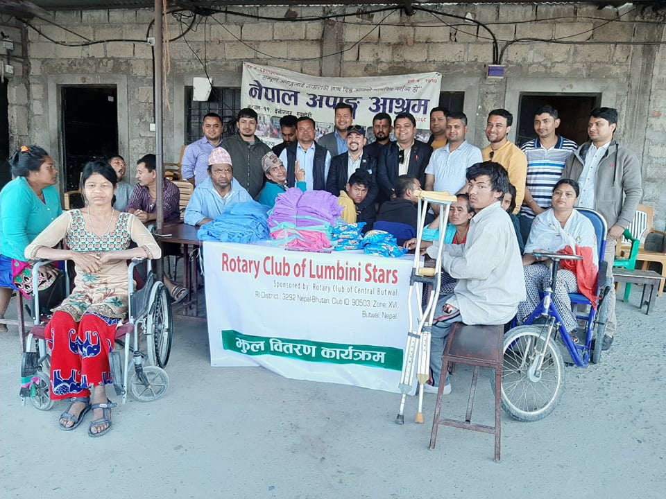 बुटवल । रोटरी क्लब अफ लुम्बिनी स्टार्सले बुटवल उपमहानगरपालिका वडा नं. ११ स्थित नेपाल अपाङ्ग आश्रममा २२ थान झुल र सर्फ वितरण गरेको छ ।