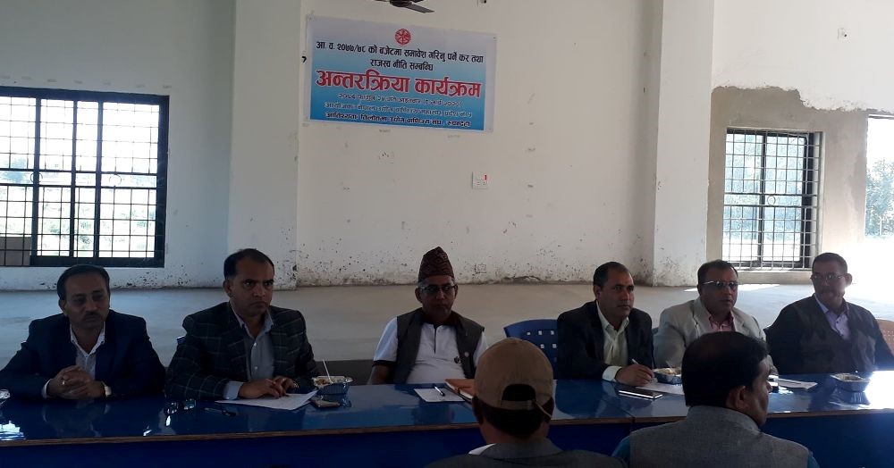 नेपाल उद्योग बाणिज्य महासंघ प्रदेश पाँच समितिको आयोजना र तिलोत्तमा उद्योग बाणिज्य संघको आतिथ्यतामा आईतबार तिलोत्तमा उद्योग बाणिज्य संघको सभाहलमा आयोजना गरिएको आ ब ०७७/७८ को बजेटमा समाबेश गरिनु पर्ने कर तथा राजश्व नीति सम्बन्धि अन्तरक्रिया कार्यक्रममा सहभागि उद्योगी ब्यवसायीहरुले सरकारको कर नीतिका कारण उद्योगी व्यबसायी मारमा परेको औंल्याएका थिए ।