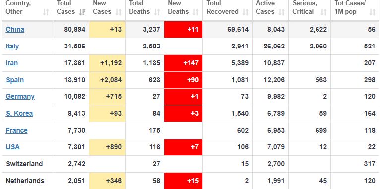 स्पेनमा २ हजार ८४, इरानमा १ हजार १ सय ९२ र अमेरिकामा ८ सय ९० जनामा थप संक्रमण भएको छ । भारतमा संक्रमितको संख्या १ सय ५२ पुगेको छ ।
