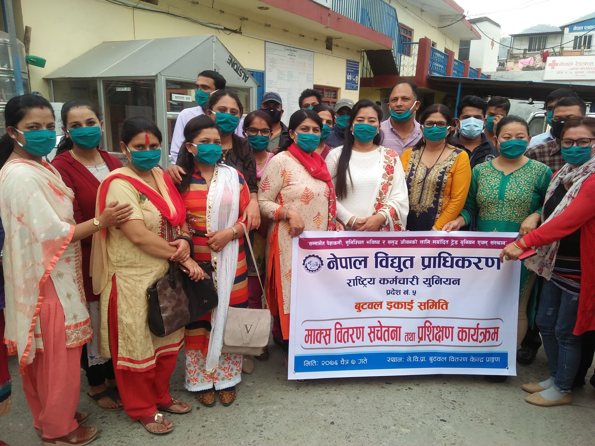 बुटवल । नेपाल बिद्युत प्राधिकरण आधिकारिक ट्रेड युनियन राष्ट्रिय कर्मचारी युनियन बुटवल बितरण केन्द्रले महामारी रुपमा अगाडि बढेको कोरोना भाइरसको बारेमा माक्स बितरण सचेतना तथा प्रशिक्षण कार्यक्रम सम्पन्न गरियो ।