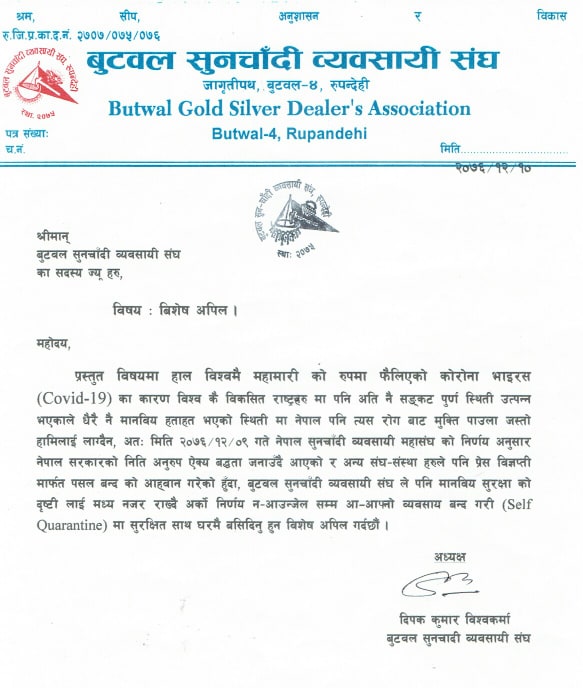 संघका अध्यक्ष दिपक कुमार विकद्वारा हस्ताक्षरित विज्ञप्तिमा नेपाल सुनचादी व्यवसायी महासंघको चैत्र ९ गतेको निर्णय अनुसार नेपाल सरकारको नीति अनुरुप एैक्यबद्धता जनाउदै व्यबसायिक प्रतिष्ठानहरु बन्द गरि सुरक्षित हन व्यबसायीलाई आग्रह गरिएको छ ।