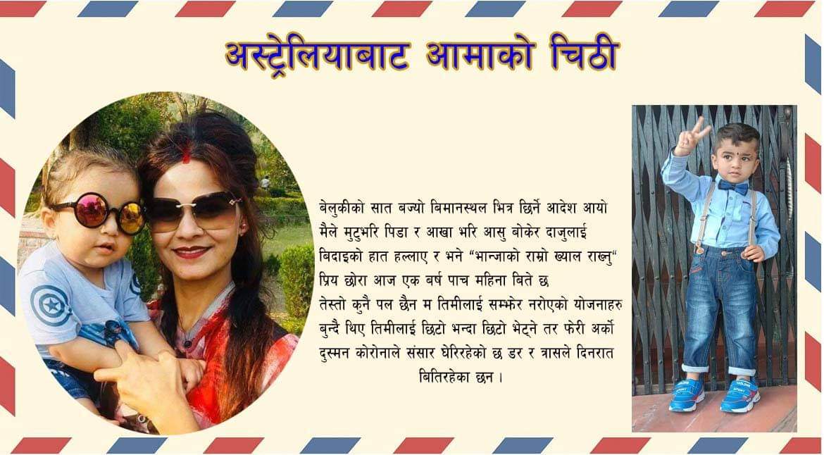 संसार भरि महामारी फैलिएको छ । अब त तिमी ठुलो भैसक्यौ सबै कुरा बुझ्ने भैसक्यौ तातो पानी पिउनु, समय समयमा साबुन पानीले हात धुनु, सफा हुनु, घर मै बस्नु, तिमीलाई गीत सुन्न र गाउन मन पर्छ रे अस्ति तिम्री सानी आमाले फोनमा भन्दै थिइ हो गीत सुन्नु, गाउनु खुशी भएर बस्नु अब हामी छिट्टै भेट्ने छौ, अ सुन त आमालाई दुख नदिनु भनेको मान्नु ज्ञानी हुनु असल हुनु सानिमा र आमाको मन कहिले नदुखाउनु ल ।