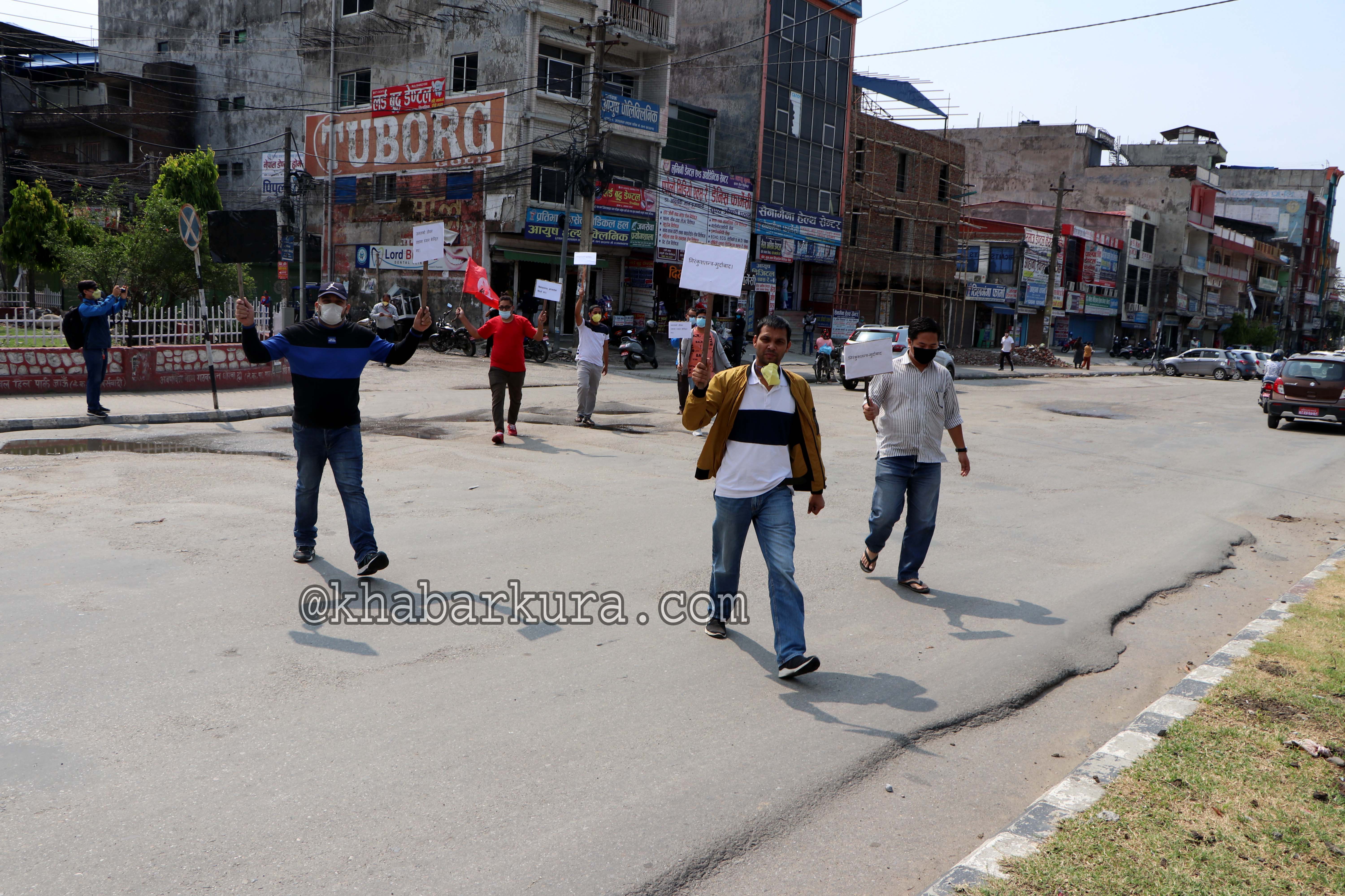 विरोध स्वरुप कालो प्लेट कार्ड, निरंकुशलता मुर्दाबाद, जनताको जिवनरक्षामा सरकार ध्यान केन्द्रित गर लगायतका प्लेटकार्ड सहित चोकमा मौन जुलुसले धर्ना दिएको थियो । नेबिसंघका केन्द्रिय उपाध्यक्ष मुक्तिराज पौडेलले सरकारको ध्यान कोरोना रोकथाममा लाग्नुपर्ने बताउनुभयो । साकेतिक रुपमा जनतालाई सुसुचित गर्न कार्यक्रम गरिएको उहाले बताउनुभयो ।
