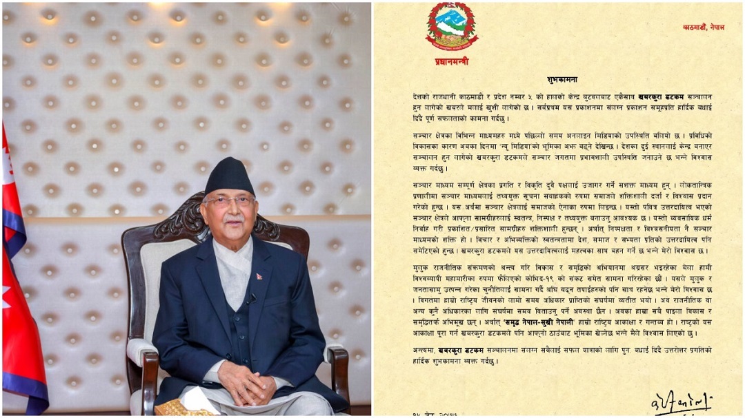 प्रधानमन्त्री ओलीले शुभकामना सन्देशमा भन्नुभएको छ, ‘विगतमा हाम्रो राष्ट्रिय जीवनको लामो समय अधिकार प्राप्तिको संघर्षमा व्यतित भयो । अब राजनीतिक वा अन्य कुनै अधिकारका लागि संघर्षमा समय बिताउनुपर्ने अवस्था छैन । अबका हाम्रा सबै पाइला विकास र समृद्धितर्फ अभिमुख छन् । अर्थात, ‘समद्ध नेपाल सुखी नेपाली’ हाम्रो राष्ट्रिय आकांक्षा र गन्तव्य हो । राष्ट्रको यस आकांक्षा पूरा गर्न खबरकुरा डटकमले पनि आफ्नो ठाउँबाट भूमिका खेल्नेछ भन्ने मैले विश्वास लिएको छु ।’