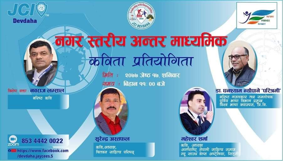 कोरोना भाईरस (कोभिड-१९) को संक्रमण फैलिन नदिनकालागि लकडाउन गरेका कारण अनलाईन प्रविधिका माध्यमबाट शनिबार देवदह जेसिजले नगर स्तरीय कबिता प्रतियोगिता गरेको हो ।