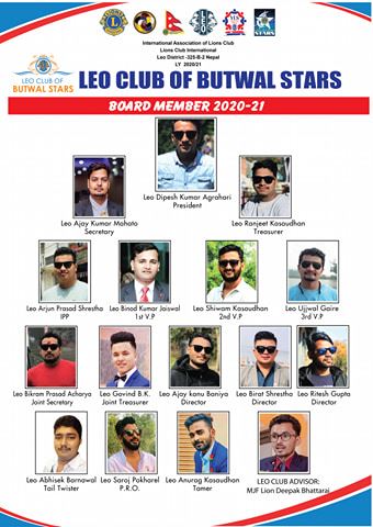 बुटवल । सामाजिक क्षेत्रमा क्रियाशिल लियो क्लब अफ बुुटवल स्टार्सको आगामी बर्ष २०२०/२१ को लागि नयाँ नेतृत्व चयन भएको छ । क्लबको आगामी बर्षको लागि नयाँ अध्यक्षको रुपमा दिपेश कुमार अग्रहरी चयन हुनुभएको छ ।