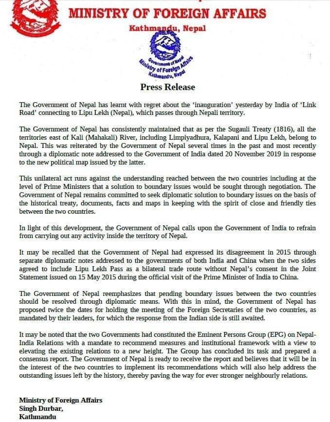 पछिल्लो समय भारतले जारी गरेको नयाँ राजनैतिक नक्शाको जवाफमा २० नोभेम्बर २०१९ मा भारत सरकारलाई सम्बोधन गरिएको कुटनैतिक नोटमा पनि यस कुरालाई दोहोर्याएको थियो । यस्तो अवस्थामा नेपाल सरकारको विना अनुमति सडक मार्ग खोल्नु नेपालको लागि दुखद् कुरा हो । यस कुराको नेपालले घोर भत्सर्ना गर्दछ । बिज्ञप्तीमा उल्लेख गरिएको छ ।