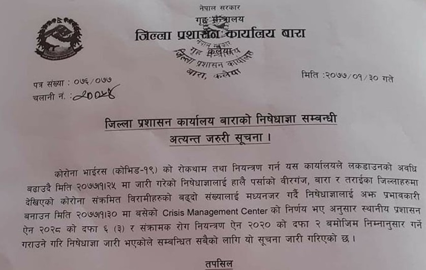 कोरोना संक्रमितको संख्यामा वृद्धि भएपछि जिल्ला प्रशासन कार्यालय बाराले निषेधाज्ञा लगाउने निर्णय गरेको हो ।