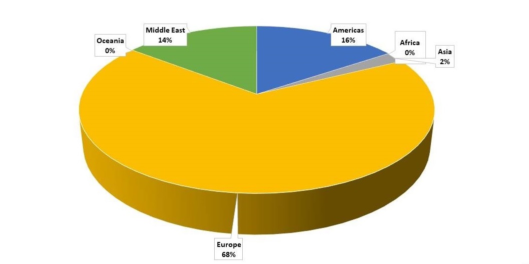 ती मध्य मध्यपूर्वमा ५३, अमेरिकामा २३, युरोप १९, एशियामा ५, प्रतिशतमा संक्रमणमा देखिएको छ ।