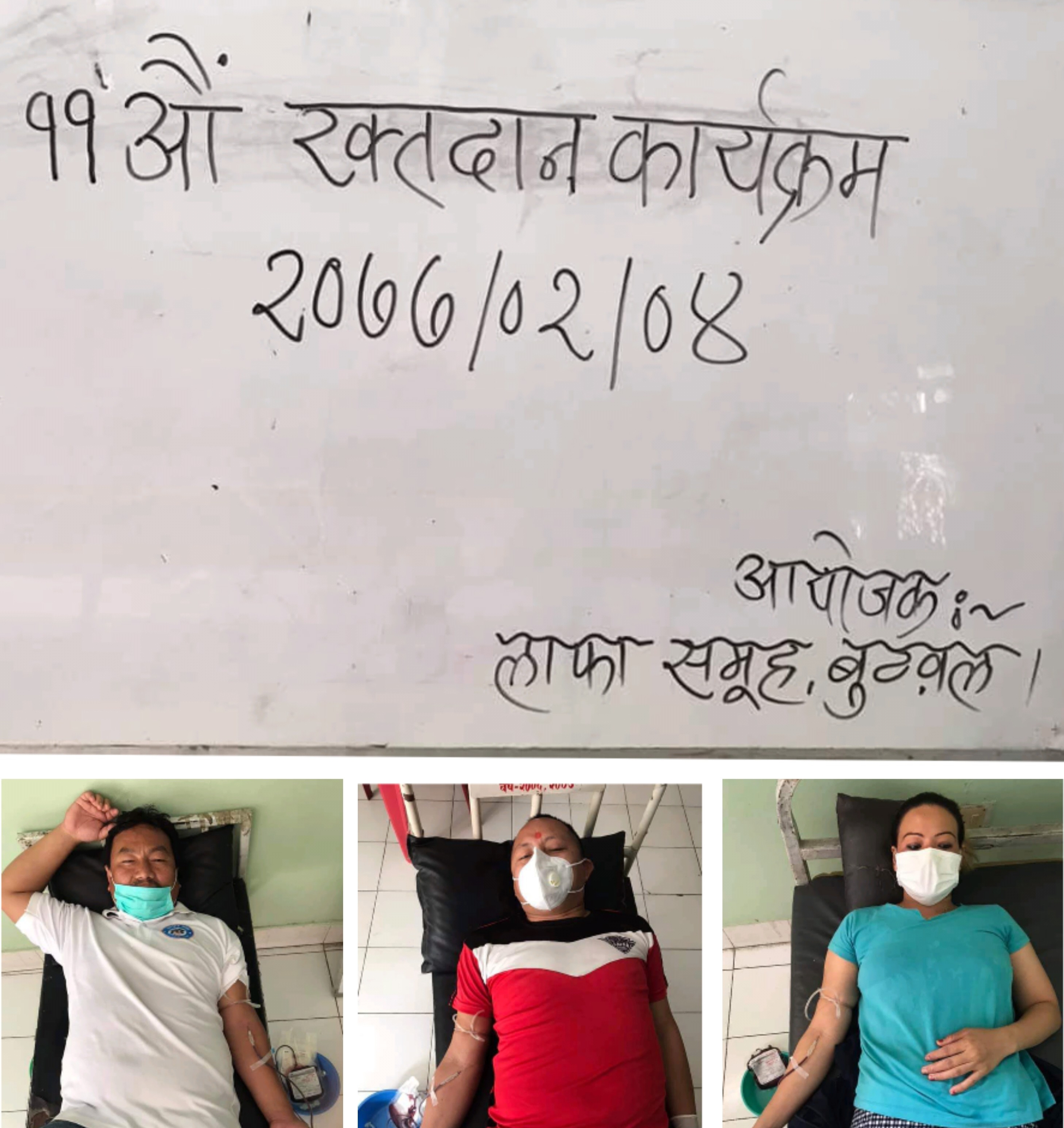 लकडाउनको कारण अहिले रक्तदानका कार्यक्रमहरु खासै नभएपछी बुटवलमा रगतको अभाव देखिन थालेपछि लाफा समुहले आकस्मिक रक्तदान गरेको हो । समुहको यो ११ औ रक्तदान कार्यक्रम गरेको हो ।