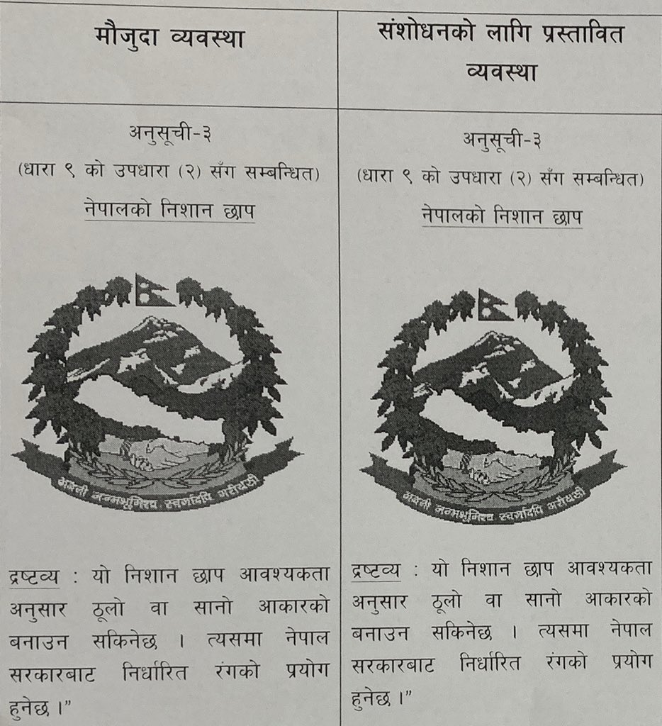 सविधानको अनुसूची ३ मा निशान छाप सम्बन्धी व्यवस्था रहेको छ । निशान छापभित्रको नक्सा मिलाउन संविधान संशोधनको प्रस्ताव दर्ता गरिएको व्यहोरा खुलाईको छ ।