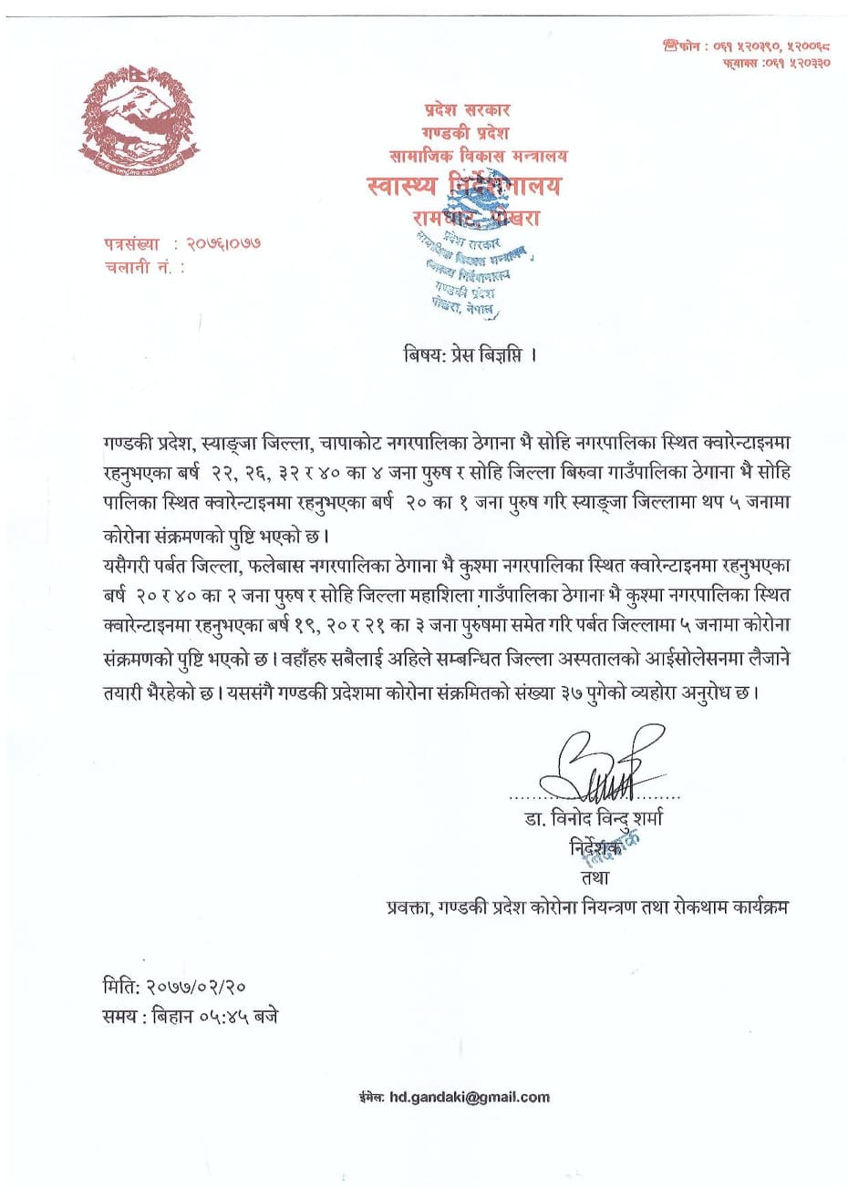 यससँगै गण्डकी प्रदेशमा ३७ जना कोरोना संक्रमित पुगेको गण्डकी स्वास्थ्य विज्ञान प्रतिष्ठानले जनाएको छ ।