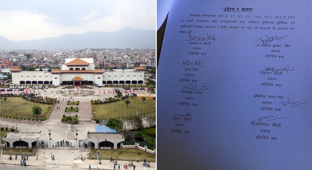 काठमाडौं । नेपाली कांग्रेसबाट मधेशको प्रतिनिधित्व गर्ने आठ सांसदले संविधान संशोधनको विधेयक दर्ता गराएका छन् ।