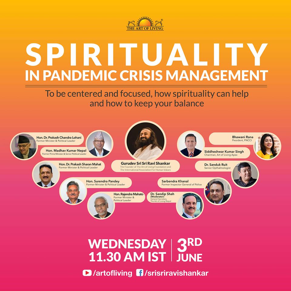 द आर्ट अफ लिभिङका संस्थापक रविशंकरले बुधबार बिहान ११ बजे कोरोना महामारी संकट व्यवस्थापनमा अध्यात्मको भूमिका विषयमा पूर्वप्रधानमन्त्री तथा नेकपाका बरिष्ठ नेता माधवकुमार नेपाल, पूर्वमन्त्रीहरु प्रकाशचन्द्र लोहनी, प्रकाश शरण महत, सुरेन्द्र पाण्डे र राजेन्द्र महतोसँग अन्तरक्रिया गर्नेछन् । सोही कार्यक्रममा पूर्वप्रहरी महानिरीक्षक शैलेन्द्र खनाल, नेपाल उद्योग वाणिज्य महासंघका अध्यक्ष भवानी राणा, बरिष्ठ नेत्ररोग विशेष डा.सन्दुक रुइत, द आर्ट अफ लिभिङ नेपालका अध्यक्ष सिद्धेश्वरकुमार सिंह र महासचिव डा.सन्दीप शाहसँग अन्तरक्रिया हुनेछ ।