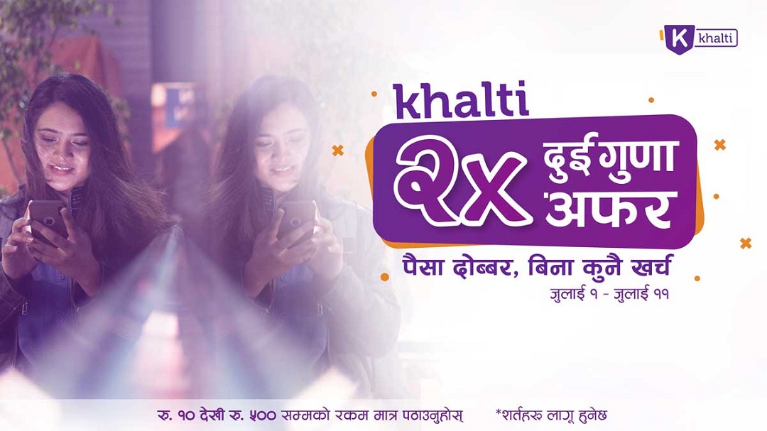 काठमाडौं । डिजिटल पेमेन्टलाई प्रोत्साहन गर्ने उद्देश्यले खल्ती डिजिटल वालेटले मोवाइल एप र खल्ती डटकम (khalti.com) वेवपेजमार्फत कारोबार गर्ने ग्राहकहरूका लागि ‘खल्तीको दुई गुणा अफर’ नामको प्रबर्धनात्मक योजना ल्याएको छ ।