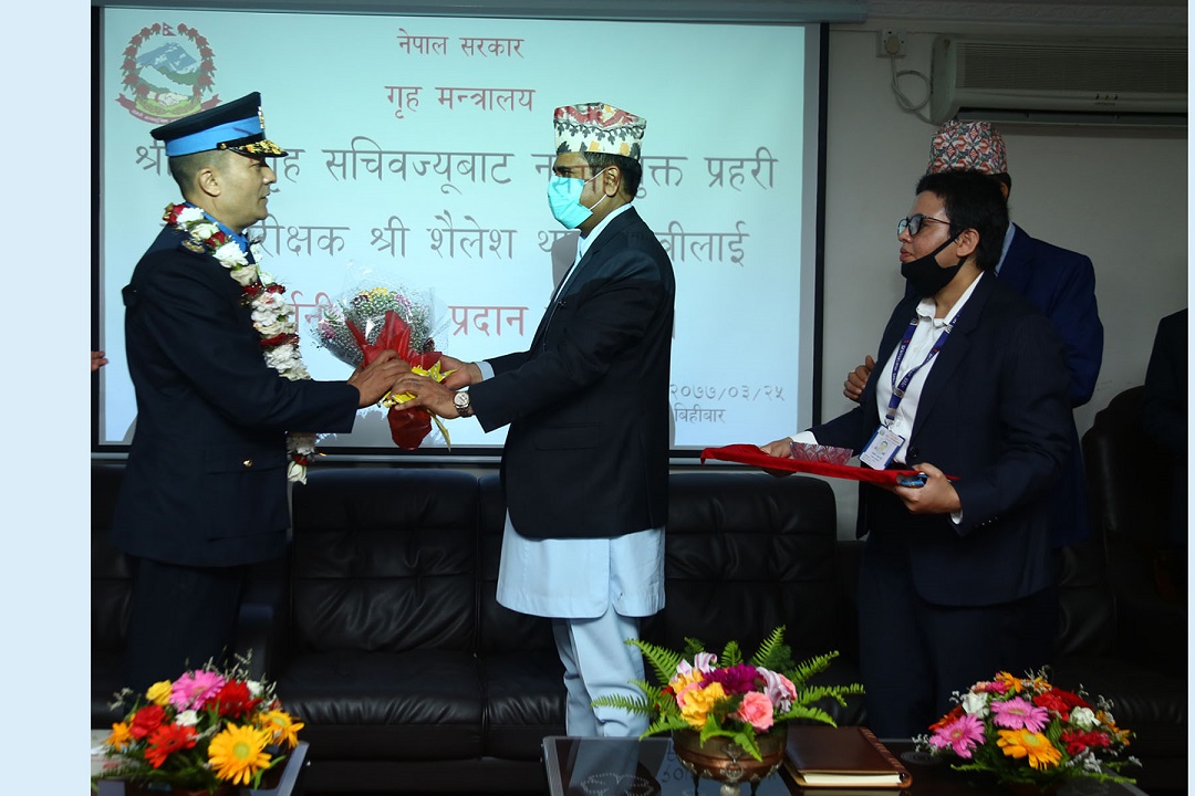 गृहमन्त्रालयमा बिहीबार आयोजित एक कार्यक्रममा गृहसचिव महेश्वर न्यौपानेले नवनियुक्त प्रहरी महानिरीक्षक क्षेत्रीलाई दज्र्यानी चिह्न प्रदान गरेका हुन् ।