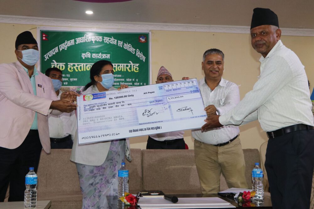शुक्रबार बुटवलमा विशेष कार्यक्रमको आयोजना गरी प्रदेश ५ को भुमि व्यवस्था कृषि तथा सहकारी मन्त्री आरती पौडेल, मन्त्रालयका सचिव तेज बहादुर सुवेदी, तिलोत्तमा नगरपालिका प्रमुख वासुदेव घिमिरे लगायतले प्रतिनिधिमुलक किसानहरुलाई संयुक्त रुपामा अनुदान चेक प्रदान गरेका हुन ।
