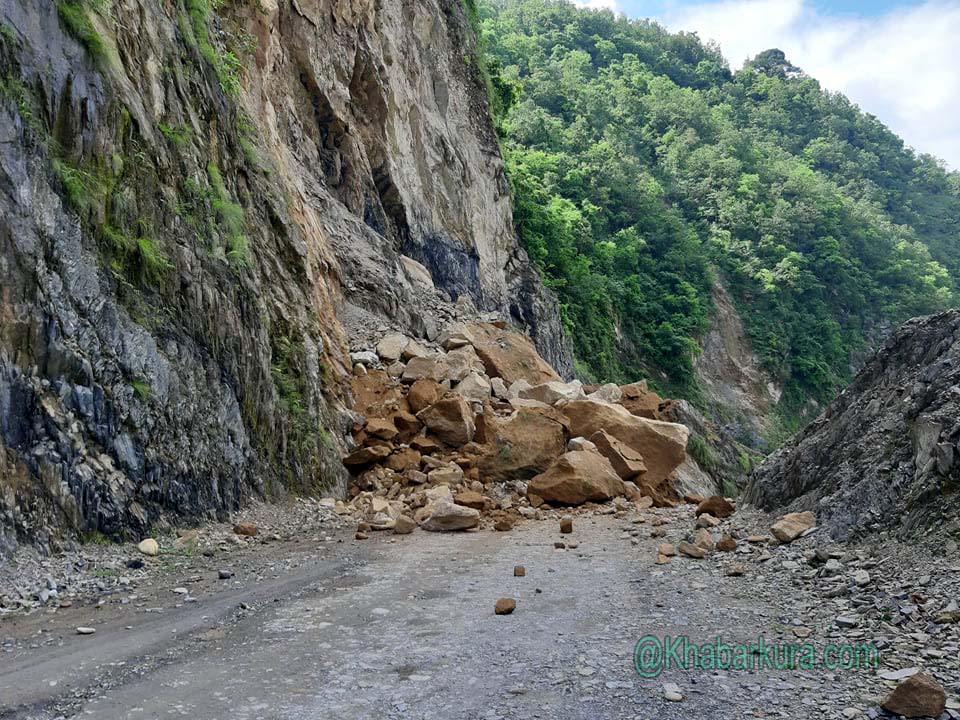 शनिवार कालिगण्डकी करिडोर अन्तर्गत जिल्लाको रुरुक्षेत्र गाउँपालिका वडानम्बर–१ को (पुल क्याम्प) खोपा भन्ने स्थानमा ठूला चट्टानसहित पहिरो खसेकाले सडक अवरुद्ध भएको जिल्ला ट्राफिक कार्यालय गुल्मीले जनाएको छ ।