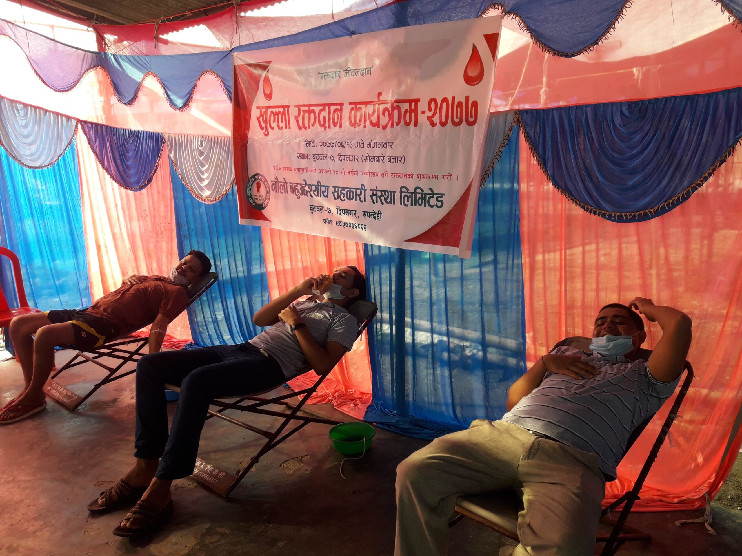 बुुुटवल । बुुटवल-७ दीपनगरस्थित नौलो बहुुउद्देश्यीय सहकारी संस्था लिमिटेडले मंगलबार बुुटवलमा खुुल्ला रक्तदान कार्यक्रम सम्पन्न गरेको छ । सहकारीले हरेक वर्ष सामाजिक उत्तरदायित्व अन्तगर्त गर्ने रक्तदान कार्यक्रमलाई यस वर्ष पनि निरन्तरता दिएको हो । रक्तदानमा सहरकारी सदस्य र अन्य व्यक्तिहरुको उत्साहजनक सहभागिता रहेको थियो । रक्तदान कार्यक्रमको बुुटवल उपमहानगरपालिकाका प्रमुख शिवराज सुुवेदीले उद्घाटन गरे ।
