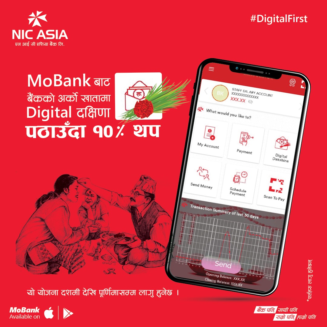 काठमाडौ । एनआईसी एशिया बैंकले दशैंमा मोबाइल बैंकिङ्गबाट दक्षिणा दिँदा १० प्रतिशत रकम थपिदिने भएको छ ।