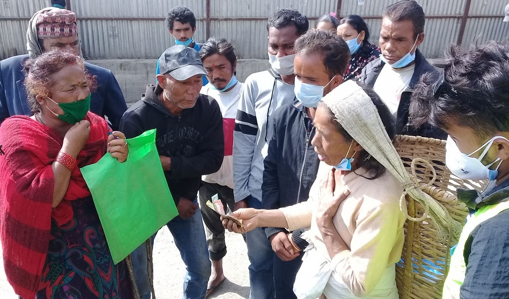 अघि सहयोग नदिने र हेरेर बस्ने सबै छक्क परे । भक्तपुर दधिकोटकी ४६ वर्षीय शारदा श्रेष्ठ,जो एकल महिला सेतो पहिरन मै छिन्, सागपात बेचेर जिविका चलाउँछिन । उनले आफूजस्तै अर्की महिला दोलखाकी पम्फा थापालाई बिहान साग बेचेर आएको रकमबाट १५५ रुपैयाँ सहयोग गरिन ।