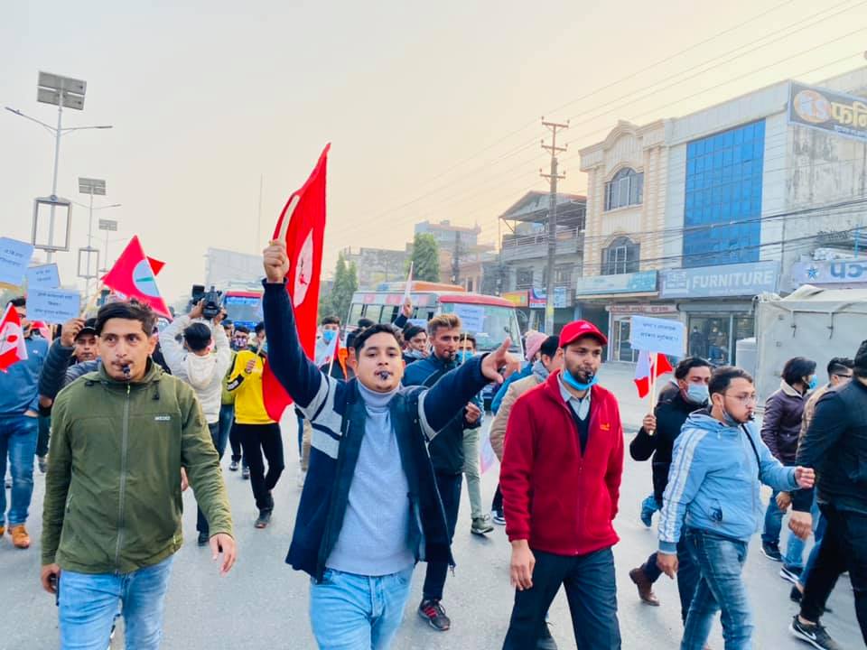 बुटवल । प्रमुख प्रतिपक्ष नेपाली कांग्रेसले आह्वान गरेको देशब्यापी बिरोध प्रदर्शनको पूर्व सन्ध्यामा बुटवलमा नेपाल विद्यार्थी संघले सरकार विरुद्ध सिठ्ठी जुलुस प्रदर्शन गरेको छ । नेविसंघ केन्द्रिय उपसभापति मुक्तिराज पौडेलको नेतृत्वमा निस्केको नेबिसंघको सिट्ठी जुलुस बुटवलको राजमार्ग चौराहाबाट सुरु भएर मिलनचोक पुगेर समापन गरिएको थियो ।