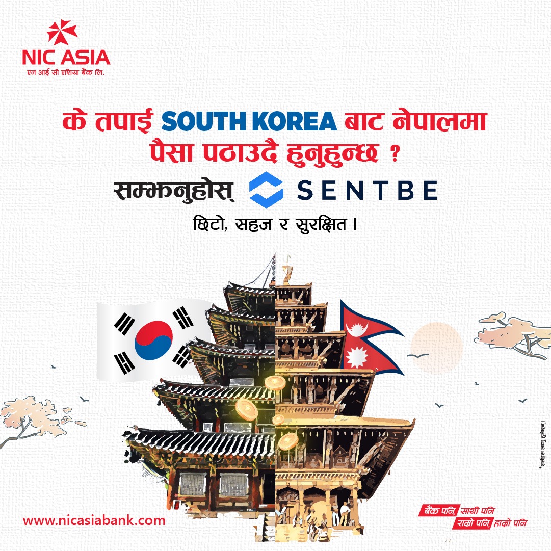 कोरियामा बसोबास गरिरहेका नेपालीहरूले sentbe रेमिटको वेबसाइट sentbe.com तथा मोबाइल एपमार्फत कुनै पनि खाता तथा आफन्तका नाममा रकम पठाउन सक्नेछन् ।