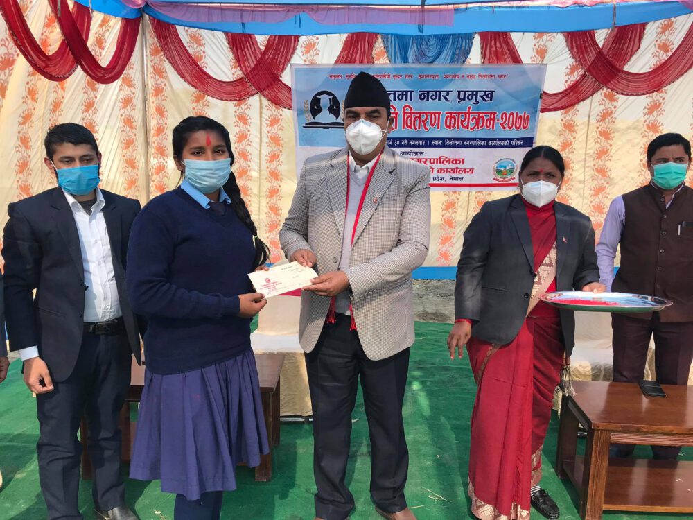 नगर प्रमुख घिमिरेले आफ्नो कार्यकालको सम्पूर्ण पारिश्रमिक छात्रवृत्तिमा लगाउने घोषणा गरेसँगै हरेक वर्ष सबै सामुदायिक विद्यालयका एक÷एक जना विद्यार्थीलाई छात्रवृत्ति प्रदान गरिँदै आइएको छ । सोही अनुसार मंगलबार कक्षा १ देखि ८ सम्म छात्रवृत्तिको लागि छनौट विद्यार्थीलाई जनहीँ ५ हजार र कक्षा ९ देखि १२ सम्मका विद्यार्थीलाई जनहीँ ७ हजार रुपैंयाँ छात्रवृत्ति रकम प्रदान गरिएको हो ।