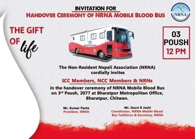 काठमाडौं । गैरआवासीय नेपाली संघले आगामी शुक्रबार (पौष ३ ) गते ‘एनआरएनए घुम्ती रगत बस’ हस्तान्तरण गर्नेभएको छ ।
