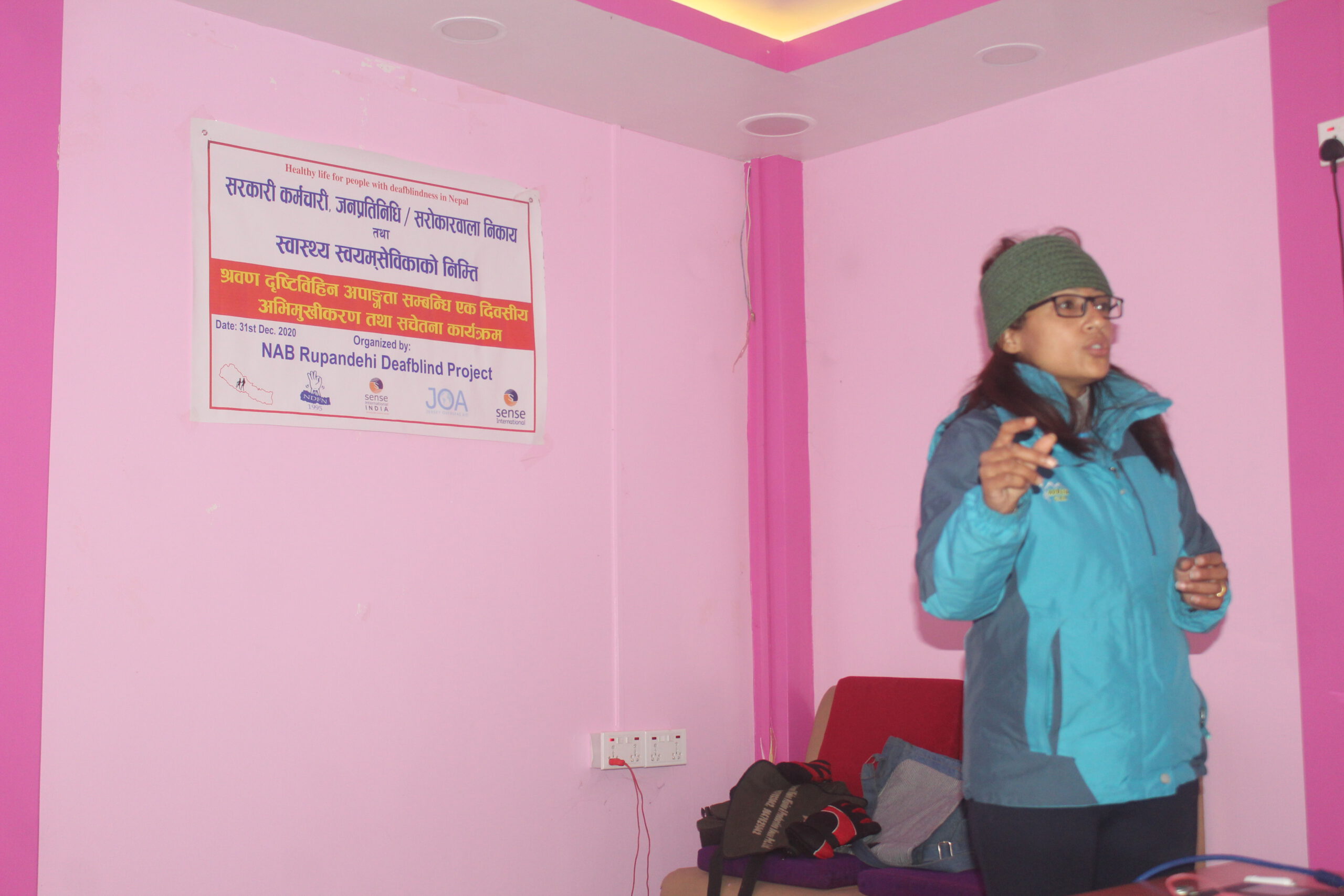 कार्यक्रममा श्रवण दृष्टिविहिन अपाङ्गता सम्बन्धी परियोजानको विषयमा फोकल पर्सनदुर्गादत्त जिसीले अपाङ्गता परिचय पत्रको विषयमा प्रकाश पारेका थिए भने परियोजानको कार्यक्रम अधिकृत अस्मिता शाक्यले श्रवण दृष्टिहिनताको अवस्था, अभिभाव तथा आम समाजको भुमिको विषयमा कार्यपत्र प्रस्तुत गरेका थिए । रुपन्देहीका संयोजक प्रेम आचार्यले परियोजानको विषयमा जानकारी दिदै आगामी कार्यक्रमको विषयमा प्रकाश पारेका थिए ।