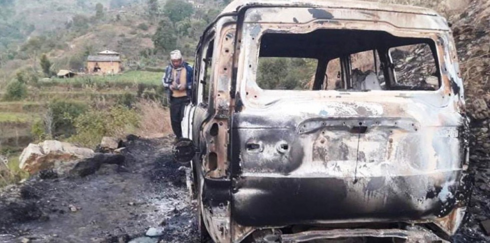 अज्ञात समूहले लगाएको आगोबाट गाडी पूर्णरुपमा जलेर नष्ट भएको छ । समितिका सभापति तथा कर्णाली प्रदेश सभाका सदस्य सिंह चढ्ने कर्णाली प्रदेश ००१ झ ००४० नम्बरको सरकारी गाडी भेरी नगरपालिका-७, पुन्मामा जलाइएको हो ।