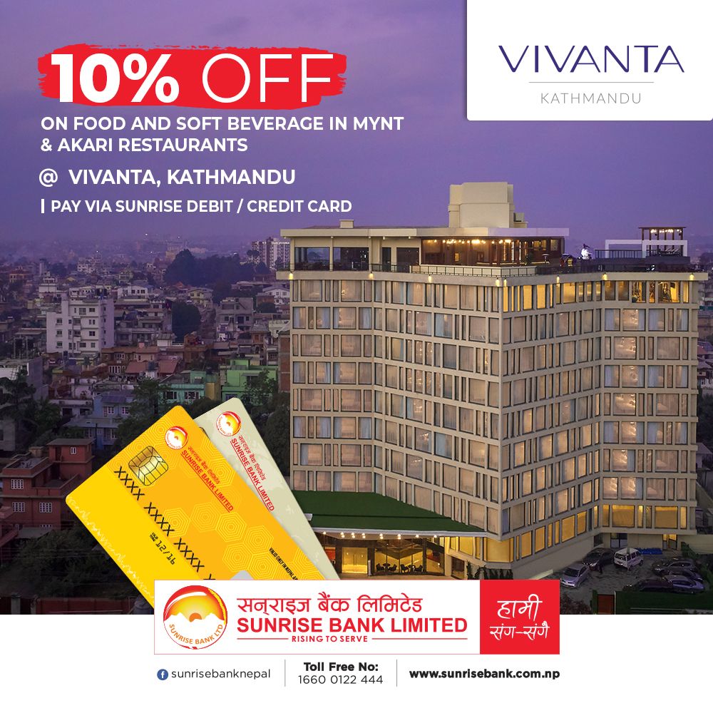 काठमाडौं । सनराइज बैंकले ग्राहकलाई भिभान्ता होटलमा विशेष छुट दिने भएको छ ।