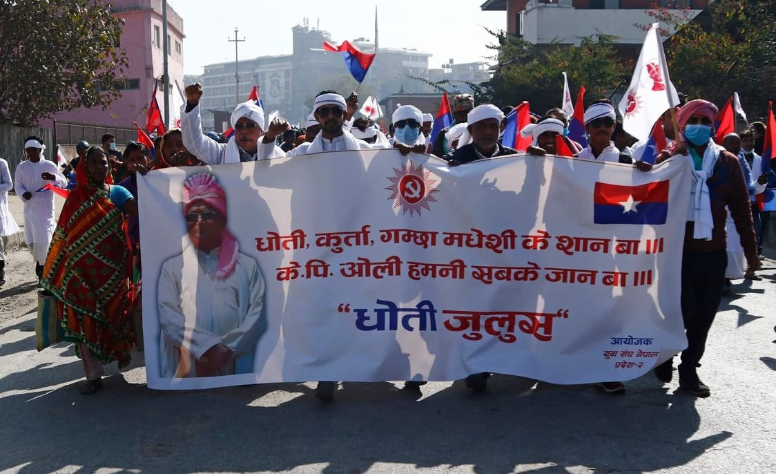राष्ट्रिय युवा संघ नेपालले प्रधानमन्त्री केपी शर्मा ओलीको समर्थनमा ‘धोती जुलुस’ आयोजना गरेको हो ।
