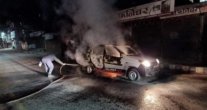 महानगरीय प्रहरी परिसर काठमाडौँका एसएसपी अशोक सिंहले दुई अज्ञात व्यक्तिले रोकिरहेको ट्याक्सीमा आगजनी गरेर भागेको बताए  आगलागीबाट पूर्ण रुपमा जलेका छन् । त्यस्तै काठमाडौंका विभिन्न स्थानमा ५ भन्दा बढी ट्याक्सी, बसमा तोडफोड भएको छ ।