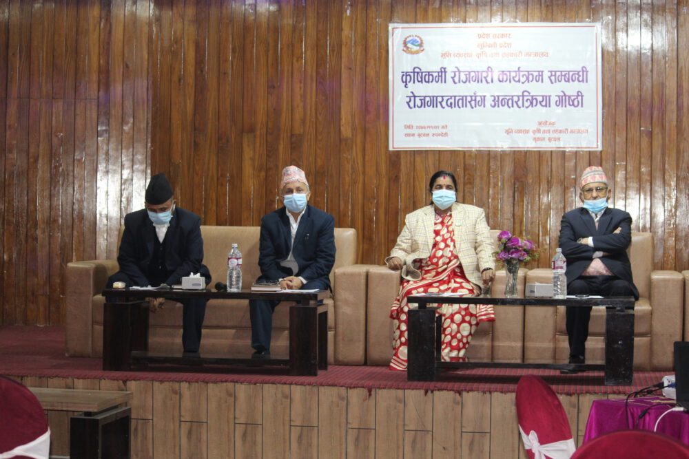 अन्तरक्रिया कार्यक्रममा बोल्दै लुम्बिनी प्रदेशका भुमि व्यवस्था कृषि तथा सहकारी मन्त्री आरती पौडेलले कृषि कर्मी रोजगार कार्यक्रममले कृषि क्षेत्रमा ठुलो परिर्वतन ल्याउने बताईन ।