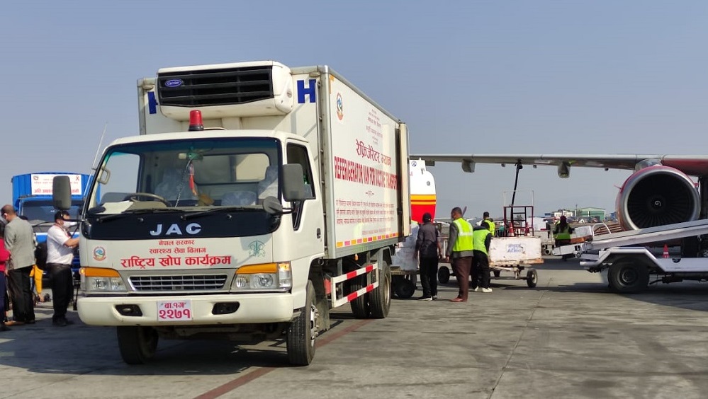 भारतको सेरम इन्स्टिच्युट अफ इन्डिया प्रालीसँग खरिद गरेको २० लाख डोज ‘कोभिसिल्ड’मध्ये आज पहिलो खेप १० लाख डोज नेपाल आइपुगेको हो ।