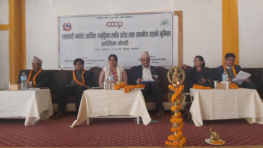 बुटवल । सहकारी मार्फत आर्थिक समृद्धिका लागि प्रदेश तथा स्थानीय पालिकाको भूमिका बिषयक दुईदिने प्रादेशिक गोष्ठी बुटवलमा सुरु भएको छ । राष्ट्रिय सहकारी महासंघको आयोजनामा बुटवलमा सुरु भएको गोष्ठीको आज एक कार्यक्रमका बीच लुम्बिनी प्रदेश सरकारका भूमि व्यवस्था, कृषि तथा सहकारी मन्त्री आरती पौडेलले उदघाटन गरिन् ।