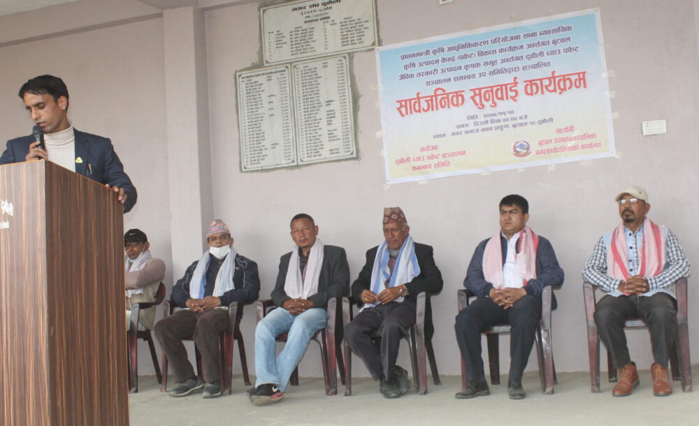 संमन्वय समितिका अध्यक्ष खिलेन्द्र पुन मगरको अध्यक्षतामा भएको कार्यक्रममा हुम नाथ आचार्यको प्रमुख आतिथ्यता रहेको थियो । सार्वजनिक सुनुवाई कार्यक्रममा बोल्दै प्रमुख अतिथि वडा अध्यक्ष अध्यक्ष हुमनाथ आचार्यले किसानहरुको साथमा वडा जहिले पनि सकारात्मक रहेको भन्दै किसानहरुले आफ्नो स्तरबाट उत्पादनयोग्य बस्तुमा विशेष जोड दिनुपर्ने बताए ।