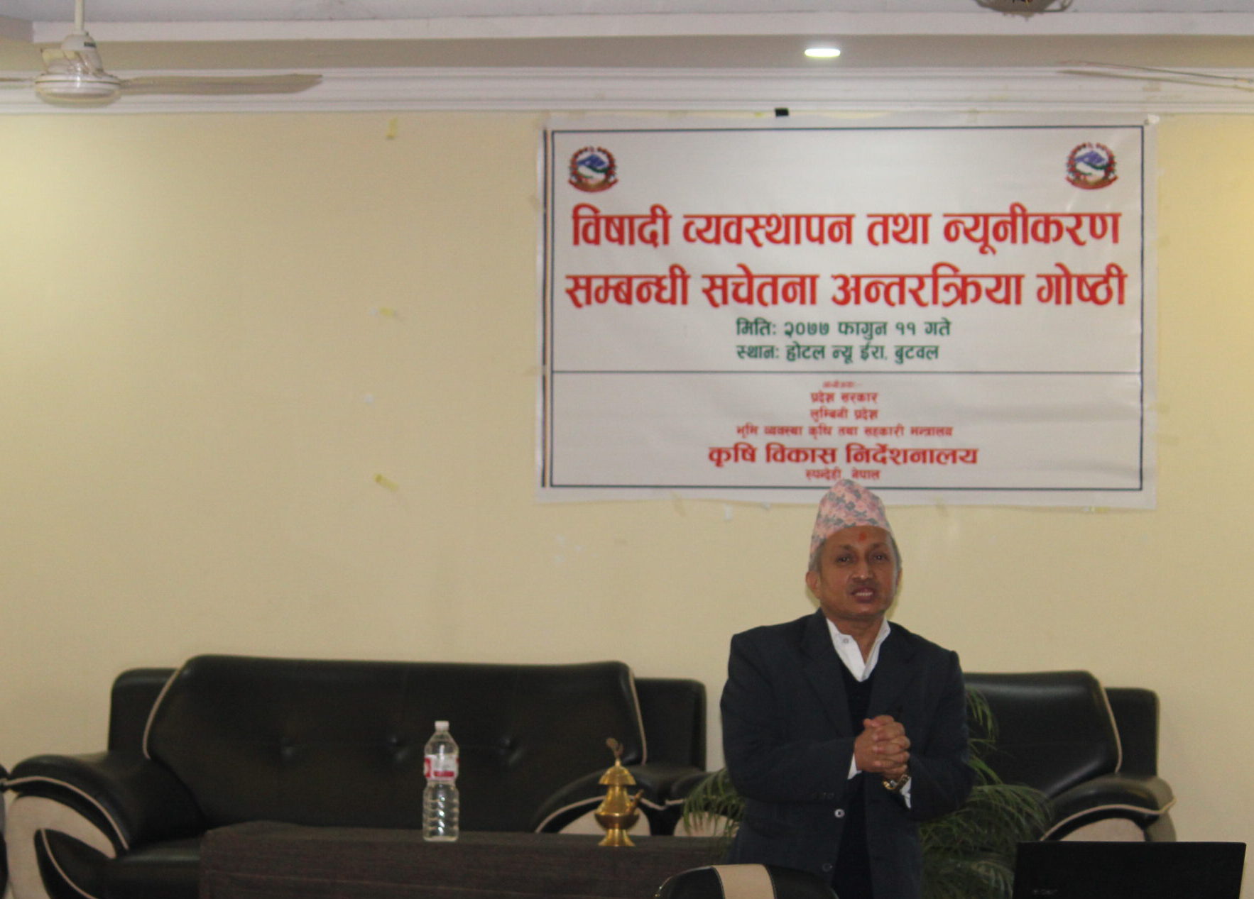 प्रदेशका विभिन्न जिल्लाहरुबाट किसान, सरोकारवाला निकायहरुको सहभागितामा बुटवलमा सचेतनामुलक अन्तरक्रिया कार्यक्रम गरिएको हो । कार्यक्रममा कृषि विकास निर्देशनालय बुटवलका प्रमुख याम नारायण देवकोटा, निर्देशनालयका बरिष्ठ बालि संरक्षण अधिकृत कामना अधिकारीले कार्यपत्र प्रस्तुत गरेका थिए ।