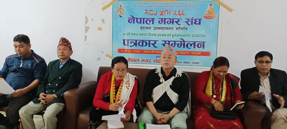 बुटवल । रुपन्देहीका मगरहरुले आफ्नो मगरात स्वायत्त प्रदेशको माग कायम रहेको बताएका छन् । मगर समूदायको ३९ औं मगर दिवसको सन्दर्भमा बुटवलमा ओयोजित पत्रकार सम्मेलनमा सहभागी रुपन्देहीका मगर अगुवाहरुले मगरहरुको भाषा, संस्कृति र भेसभुषा जबर्जस्ती खाेसिएको बताउंदै मगरात राज्य र पाठ्यक्रममा मगर भाषालाई समावेश नगर्दा सम्म मगरहरुको आन्दोलन जारी रहने बताए ।