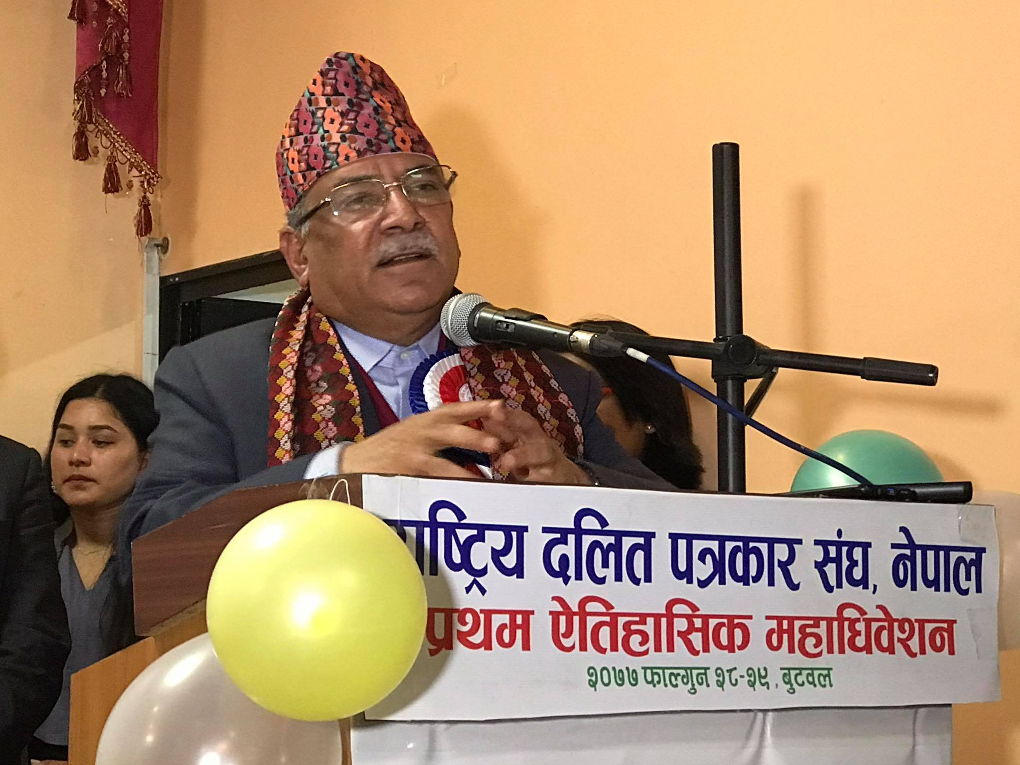 बुटवलमा राष्ट्रिय दलित पत्रकार संघ, नेपाल प्रथम महाधिवेशन उदघाटन समारोहलाई सम्बोधन गर्दै अध्यक्ष प्रचण्डले पछिल्लो केही समय यता देशमा परिवर्तनलाई उल्ट्याउन अनिष्टकारी घटना निम्त्याउन खोजिएको बताएका हुन् । प्रचण्डले देशमा संविधानलाई रक्षा गर्ने कि हत्या गर्ने भन्ने बहस सुरु भएको बताए । प्रचण्डले भने, ‘संविधानमा नपुगेका कुरालाई थप गर्दै लैजाने किअहिलेका उपलब्धीलाई हत्या गर्ने भन्ने बहस जारी छ ।