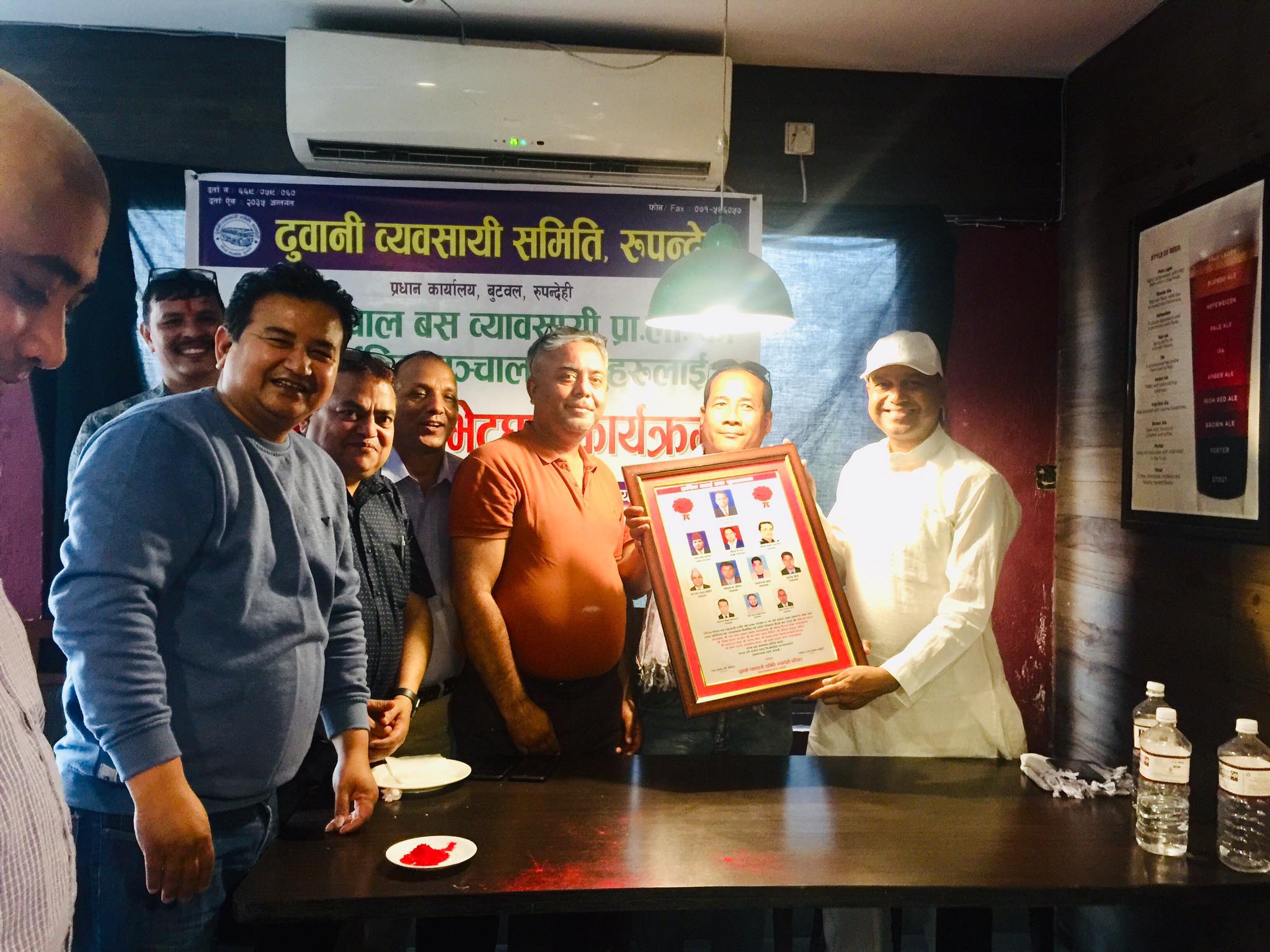 बुटवल । ढुवानी व्यवसायी समिति, रुपन्देहीले पश्चिम नेपाल बस व्यवसायी प्रा.ली.को हालै सम्पन्न अधिवेशनबाट निर्वाचित सञ्चालक समितिलाई शुक्रवार एक कार्यक्रमको आयोजना गरि सम्मान गरेको छ ।