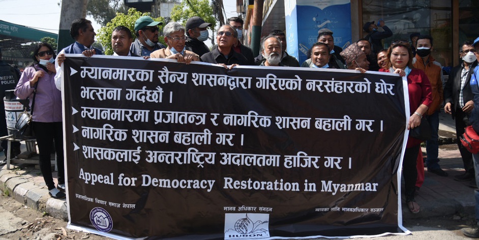 प्रजातान्त्रिक विचार समाज नेपाल, मानव अधिकार सङ्गठन र न्यायका लागि मानवअधिकार सञ्जालले शुक्रबार विहान संयुक्त रुपमा विरोध प्रदर्शन गरेका हुन् । म्यानमारमा भएको नरसंहारको विरुद्धमा उत्रिएका मानवअधिकारकर्मीहरुले भारत र चीनले समेत दमनको मौन समर्थन दिएको भन्दै विरोध जनाएका छन् ।