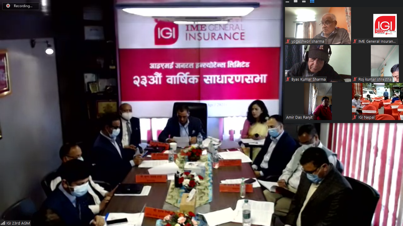 काठमाडौ । आइएमई जनरल इन्स्योेरेन्स लिमिटेडको २३औं बार्षिक साधारण सभा गरेको छ । कोभिड(१९ को दोश्रो लहरको कारणले गर्दा नेपाल सरकारले २५ जनाभन्दा बढी व्यक्ति भेला भएर सभा सम्मेलन नगर्न सूचना जारी हुँदा कम्पनीले जुमको माध्यामबाट कम्पनीको २३औं साधारण सभा सम्पन्न गरेको हो ।