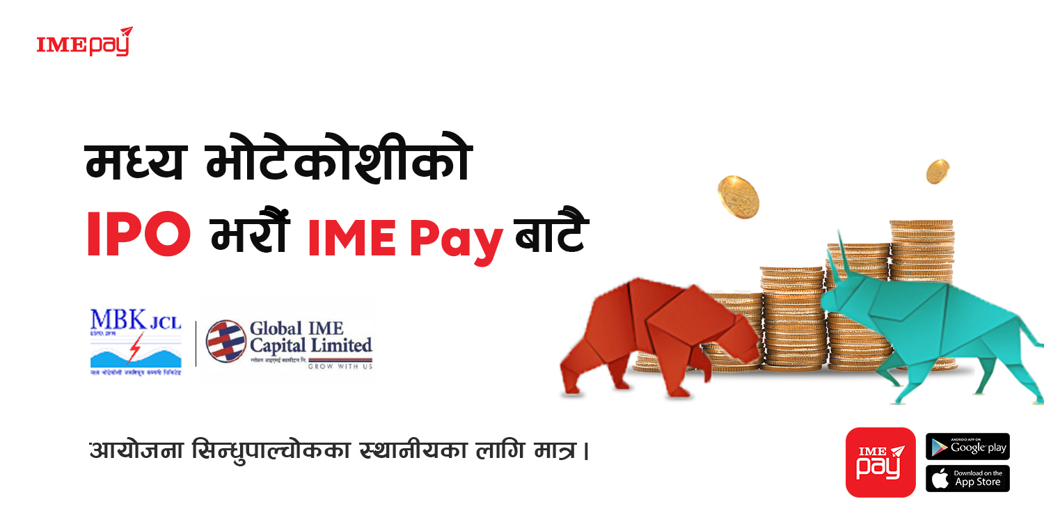 यसलाई बैंकिङ्ग भाषामा नो योर कस्टुमर (केवासी) फारम भनिन्छ । त्यसपछि तपाइँ एपको गृहपृष्ठमा प्रवेश गर्न सक्नुहुनेछ त्यहाँ तपाइँले ‘आइपीओ’ आइकनमा क्लिक गर्नुपर्ने हुन्छ । त्यसपछि आइपीओसँग सम्बन्धित आफ्नो सवै विवरण भर्नुहोस् र त्यसलाई एकपटक रूजु गरी आफ्नो पीन कोड थिच्नुहोस् । यसरी तपाइँले आफ्नै मोबाइलबाट घरमै बसी आइएमई पे मार्फत मध्य भोटेकोशीको आइपीओ भर्न सक्नुहुनेछ । यसरी आइपीओ भर्दा तपाइँलाई कुनै अतिरिक्त सेवा शूल्क लाग्नेछैन ।