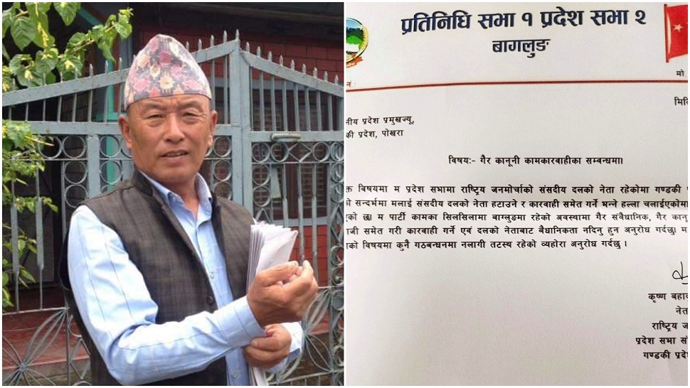 थापाले प्रदेश प्रमुखको नाममा पत्र पठाउँदै जनमोर्चाको नाममा आफुमाथि कीर्ते जालसाझी गरी कारवाही गरेको आरोप लगाउँदै त्यसलाई मान्यता नदिन प्रदेश प्रमुखलाई आग्रह गरेका हुन् । यद्यपी, संसदीय दलको नेता या सांसदबारे निर्णय गर्ने अधिकारी प्रदेश प्रमुखलाई नभै प्रदेशसभा सचिवालयलाई हुन्छ ।