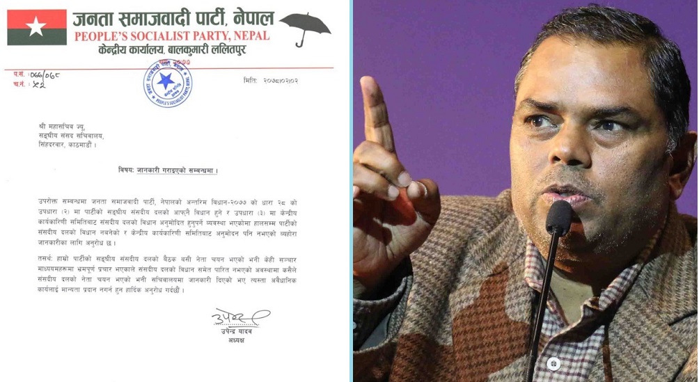 अध्यक्ष ठाकुरले वैशाख ३० गते संसदीय दलको बैठक बसेर दलको नेतामा राजेन्द्र महतोलाई चयन गरेको पत्र संसद सचिवालयमा दर्ता गराएपछि अर्का अध्यक्ष यादवले त्यसको काउन्टर गरेका छन् ।